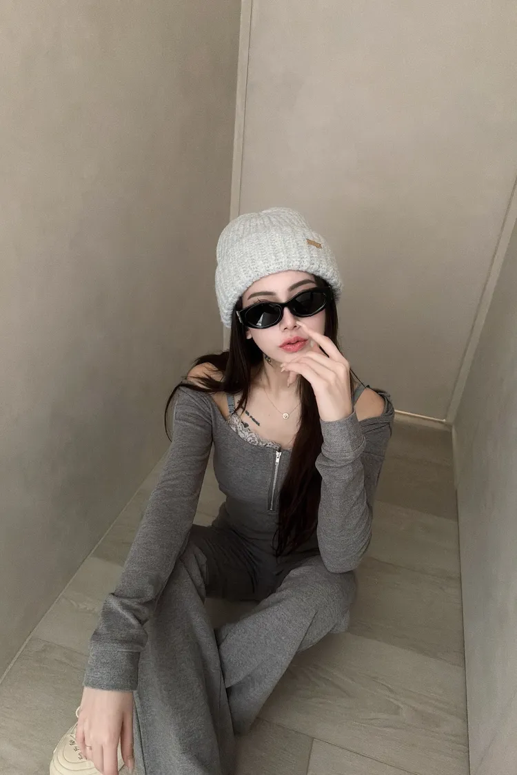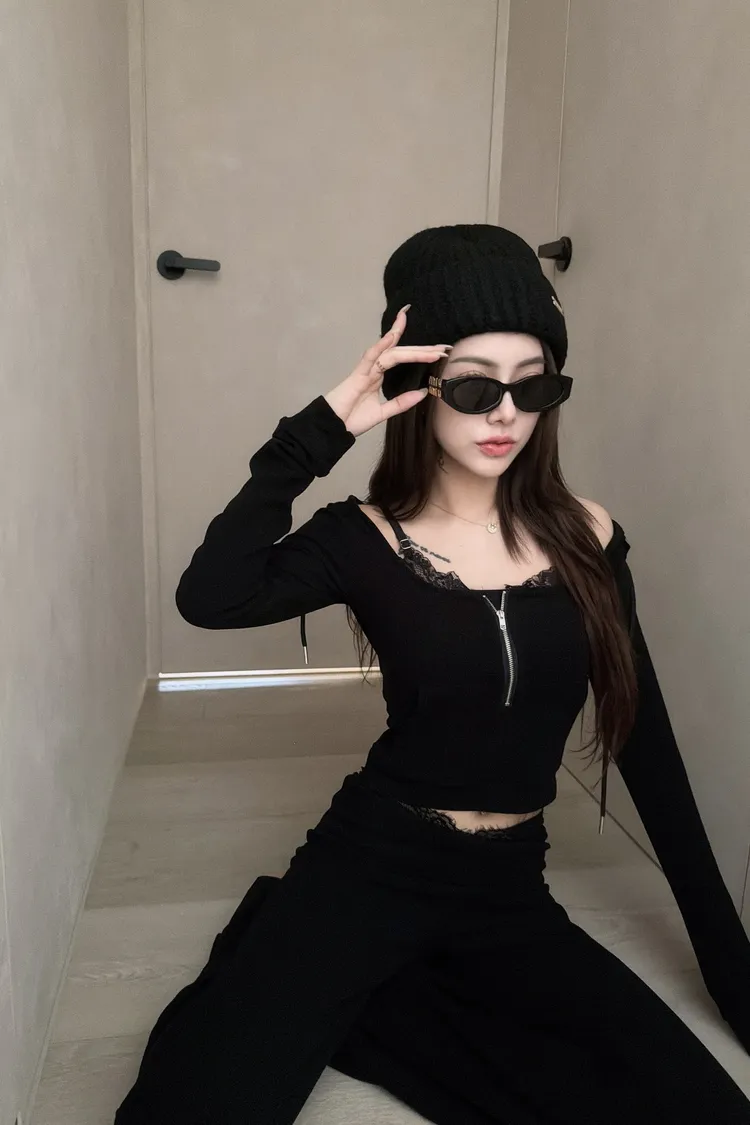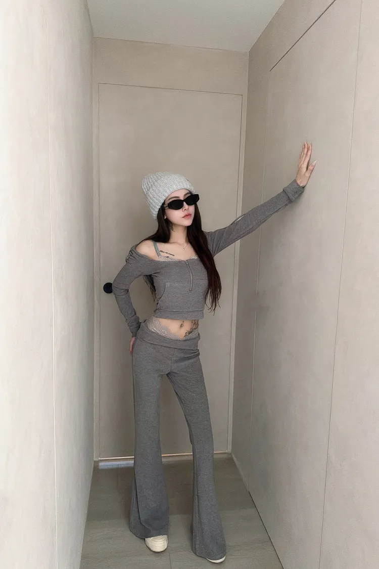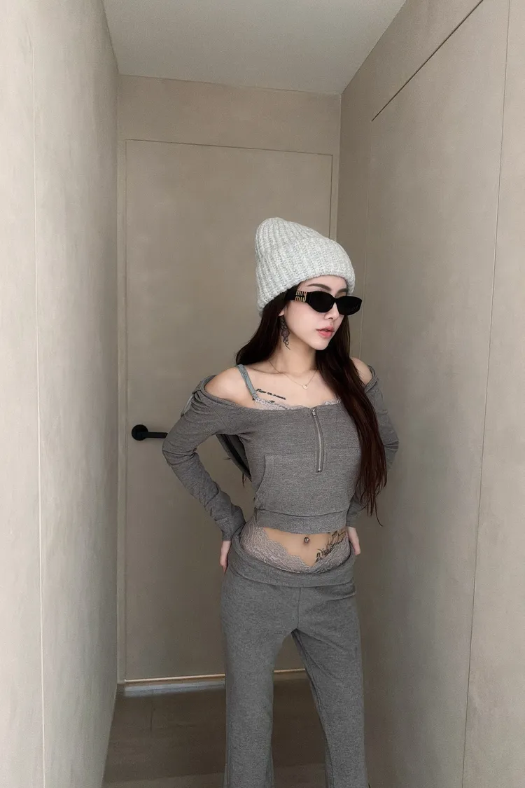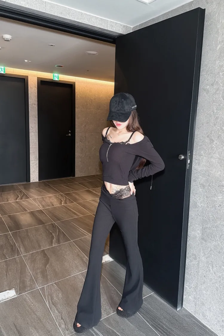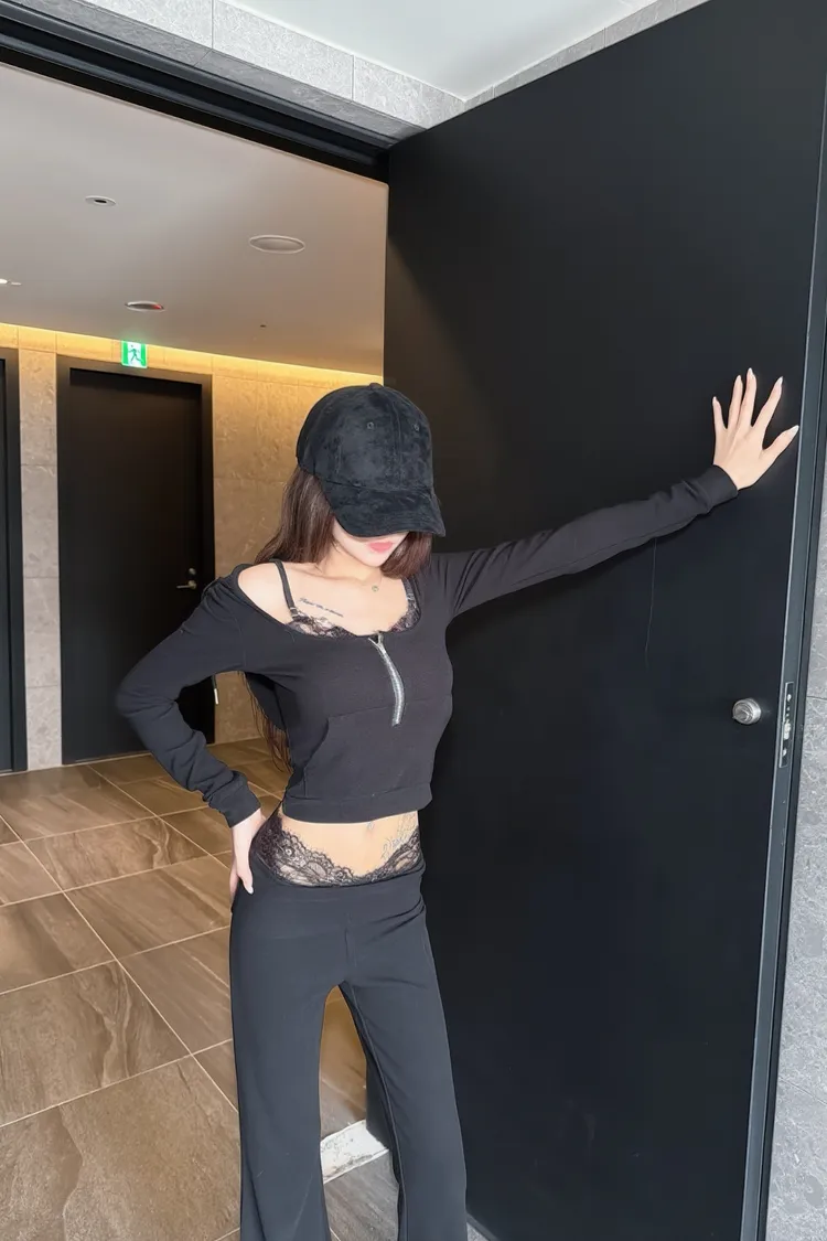 假兩件蕾絲設計🤩 性感短版連帽+喇叭褲